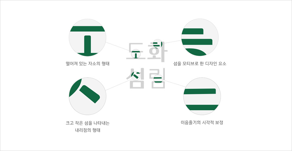 완도청정바다체는 섬을 모티브로 다도해를 품고 있는 완도군의 모습을 각 형태로 표현하였습니다. [ㅅ, ㅈ, ㅊ]꼴의 떨어져 있는 내리점은 완도의 크고 작은 섬들을 의미하며, 모든 획의 상단 굴림 부분과 하단의 직선 표현은 바다에 떠있는 섬을 형상화하였습니다.