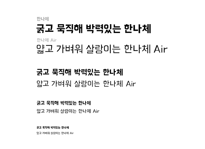 배달의민족 한나체 Air는 굵고 힘찬 타이틀 전용 서체 ‘한나는열한살체’를 사랑하는 많은 분들이 본문용으로 사용하기에, 우아한 시각문화를 위해 본문용 서체로 만든 것입니다. 작게 쓸수록 우아하고 잘 읽히는 것이 특징입니다.