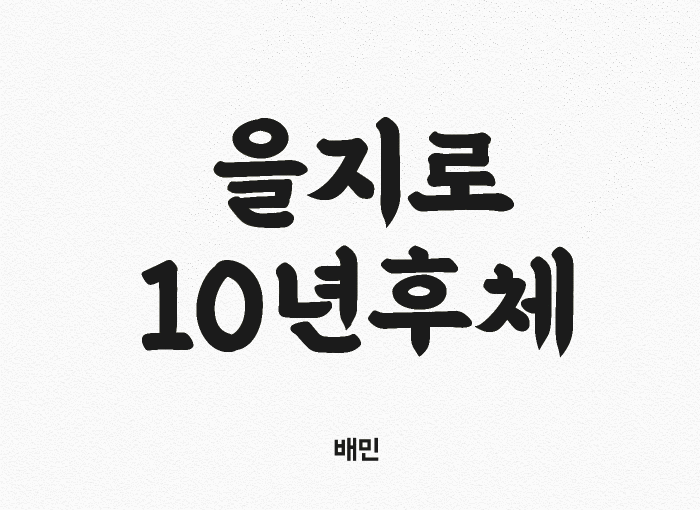 ‘배민 을지로10년후체’는 ‘배민 을지로체’의 10년 후 모습을 상상하여 만들었습니다. 10년 동안 시간이 지나며 쌓인 햇빛과 비바람의 흔적을 느낄 수 있는 것이 특징입니다. (더 닳아진 글자는 대체문자 기능이 지원되는 프로그램에서 사용할 수 있습니다.)